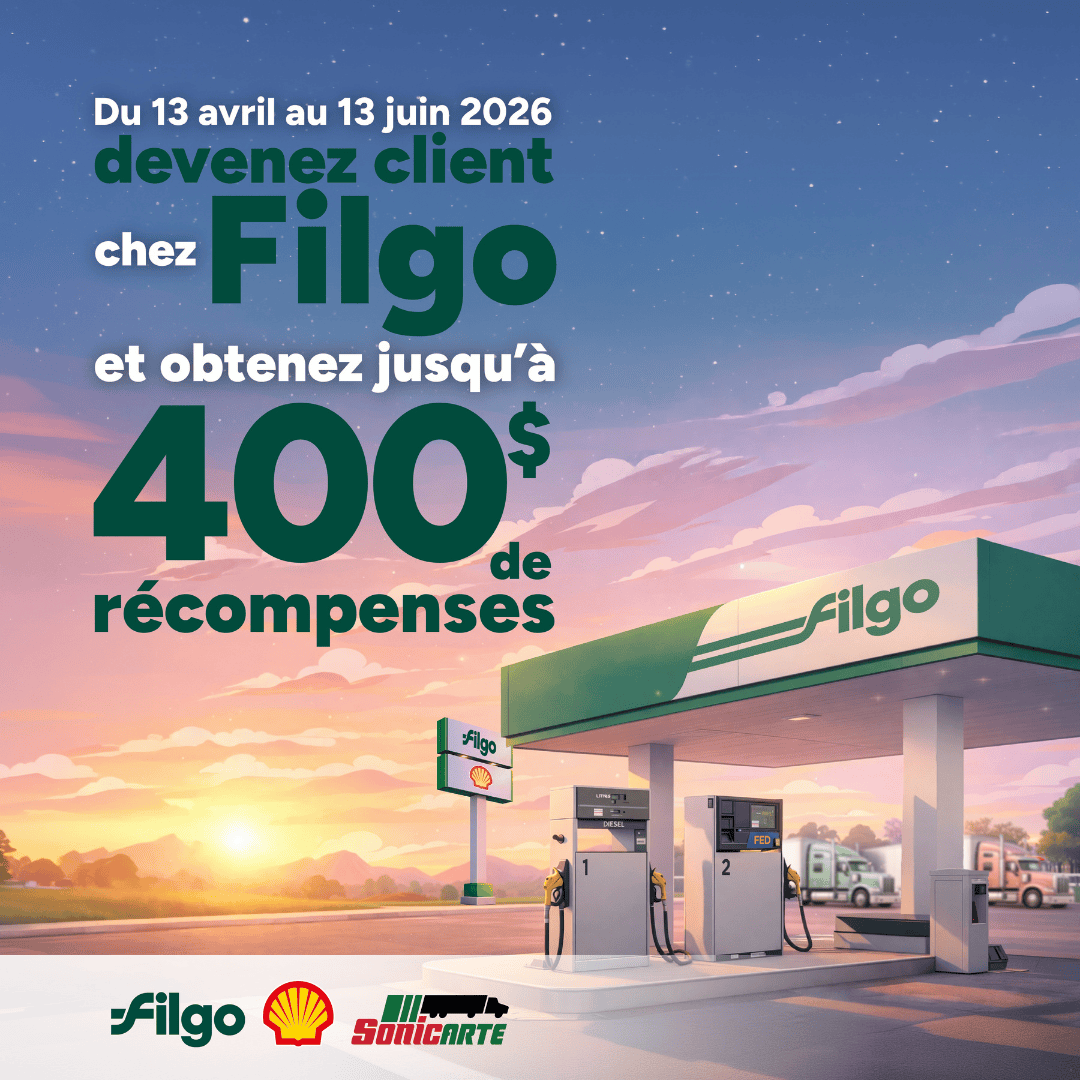 Du 13 avril 2026 au 13 juin 2026, profitez d’une offre exclusive en devenant client Cardlock Filgo. Accédez à un large réseau de stations commerciales Filgo et Sonicarte et obtenez jusqu’à 400 $ en récompenses. Une façon simple et avantageuse de gérer votre carburant tout en maximisant chaque plein.